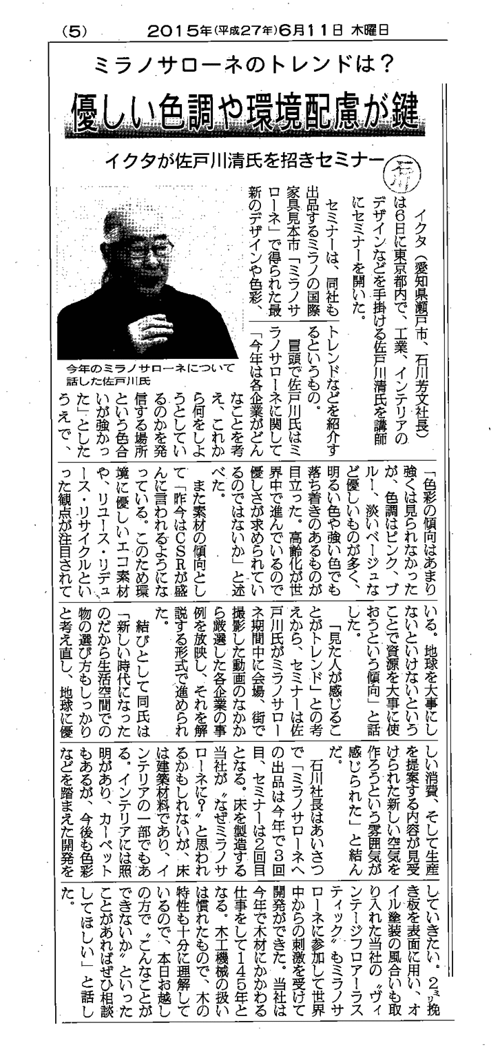 ミラノサローネのトレンドは?優しい色調や環境配慮が鍵イクタが佐戸川清氏を招きセミナー 日刊木材新聞より ミラノサローネのトレンドは?優しい色調や環境配慮が鍵 01 最新の投稿午後のひと時(九州の車窓から編)2016年12月22日No comments yetikuta走友会活動報告~2016年12月11日No comments yet吉田花子展!!2016年10月26日No comments yet第24回イクタゴルフコンペ2016年10月23日No comments yet宇都宮夫婦の結婚お祝い会を行いましたー!2016年9月18日No comments yet « 『アイラブホームフェアIN北九州』展示会 (ギャラリー) 『ミラノサローネ』セミナー開く – イクタ、3年連続で床材を出品 »