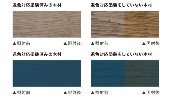木材の変色をもたらす大きな原因は光です。深みのある色味や美しい発色を長くお楽しみいただくために、日焼けで色が変わりにくいイクタオリジナル特殊塗装を表面に施すことで、退色を最小限に抑えています。