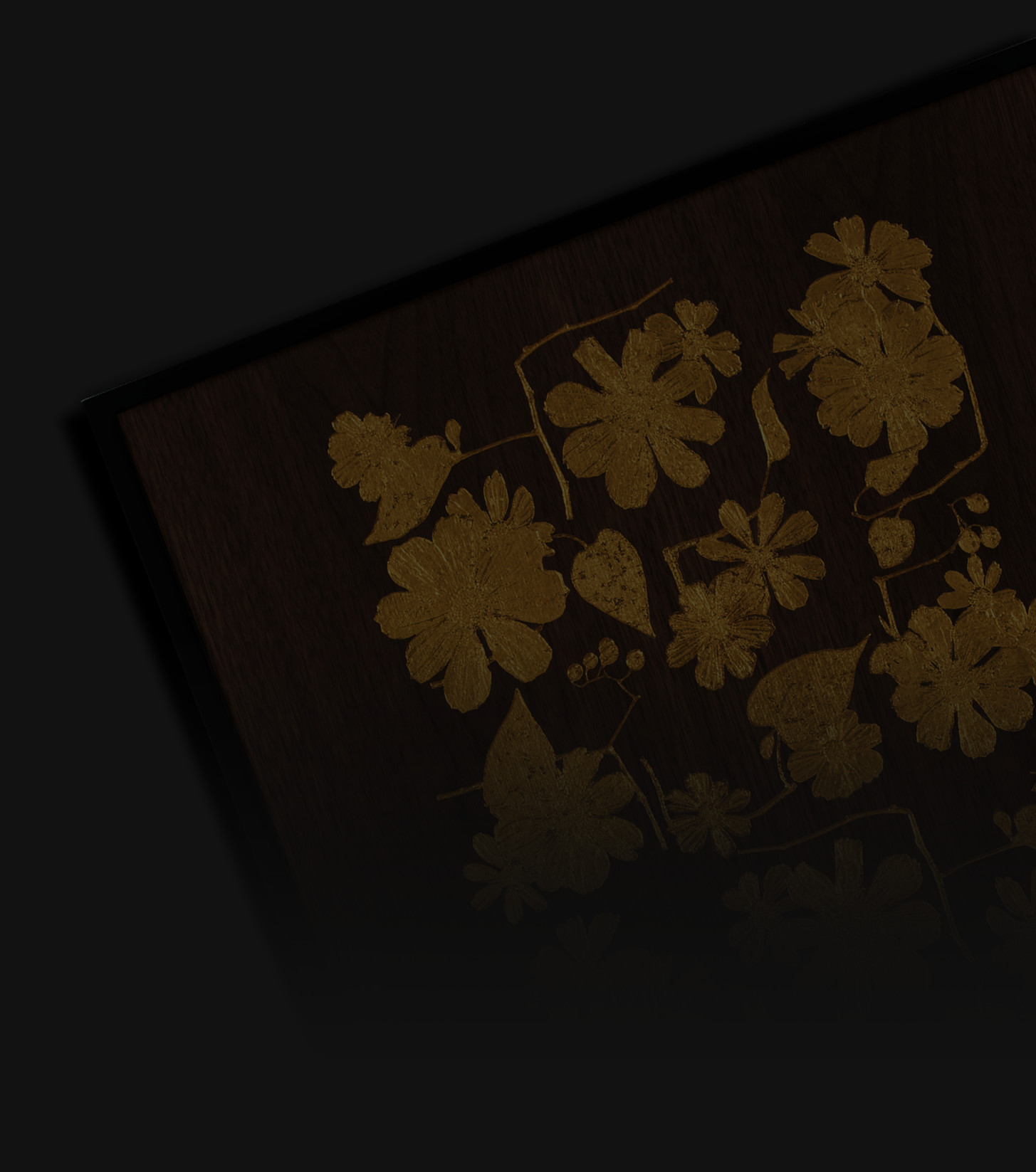 伝統を誇る日本の箔技術が出合い、木片に金箔を張り合わせる金箔工芸表現がIKUTAを繋ぎ手として誕生、『花グラフィック』に新たな世界観をもたらしました。